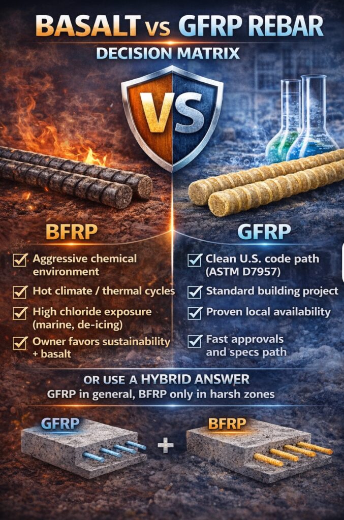 | Marine / chloride-heavy exposure, long design life | BFRP or high-grade GFRP | BFRP often shows stronger durability retention in aggressive environments; confirm resin + tests |