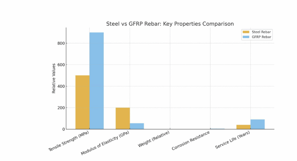 By contrast, fiberglass rebar (GFRP) offers: